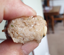 The sausages did cut easily and the texture was just about medium.  The bite and chew was good and the "warm spices" were good too but the apple pieces were some what tough which was odd as the succulence was pretty good. Not sure why the toughness of the apple though. Did we over cook? The fact remains the apple pieces weren't as expected and spoiled the sausages to be honest.