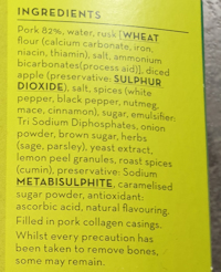 The Porky Whites packaging has the recently been updated to a new style which we understand to be referred to as "dinner inspiration" and like their other packs it also carries a novel QR code on the back which links to some interesting recipes etc., on Porky Whites own web site. This packaging says that these are made from 82% of the finest cuts of pork with the sweetness of diced fresh apples and some warm spices for the taste of a succulent hog roast...they do like their statements!
